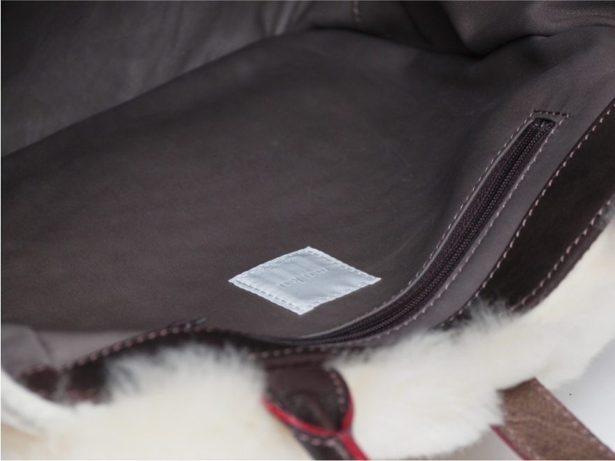 金具やファスナーはピンクゴールド、裏地には手触りの良いポニーレザーを使用し、上質でエレガントなイメージ。ベジタブルタンニンヌメを付属革で使っています。