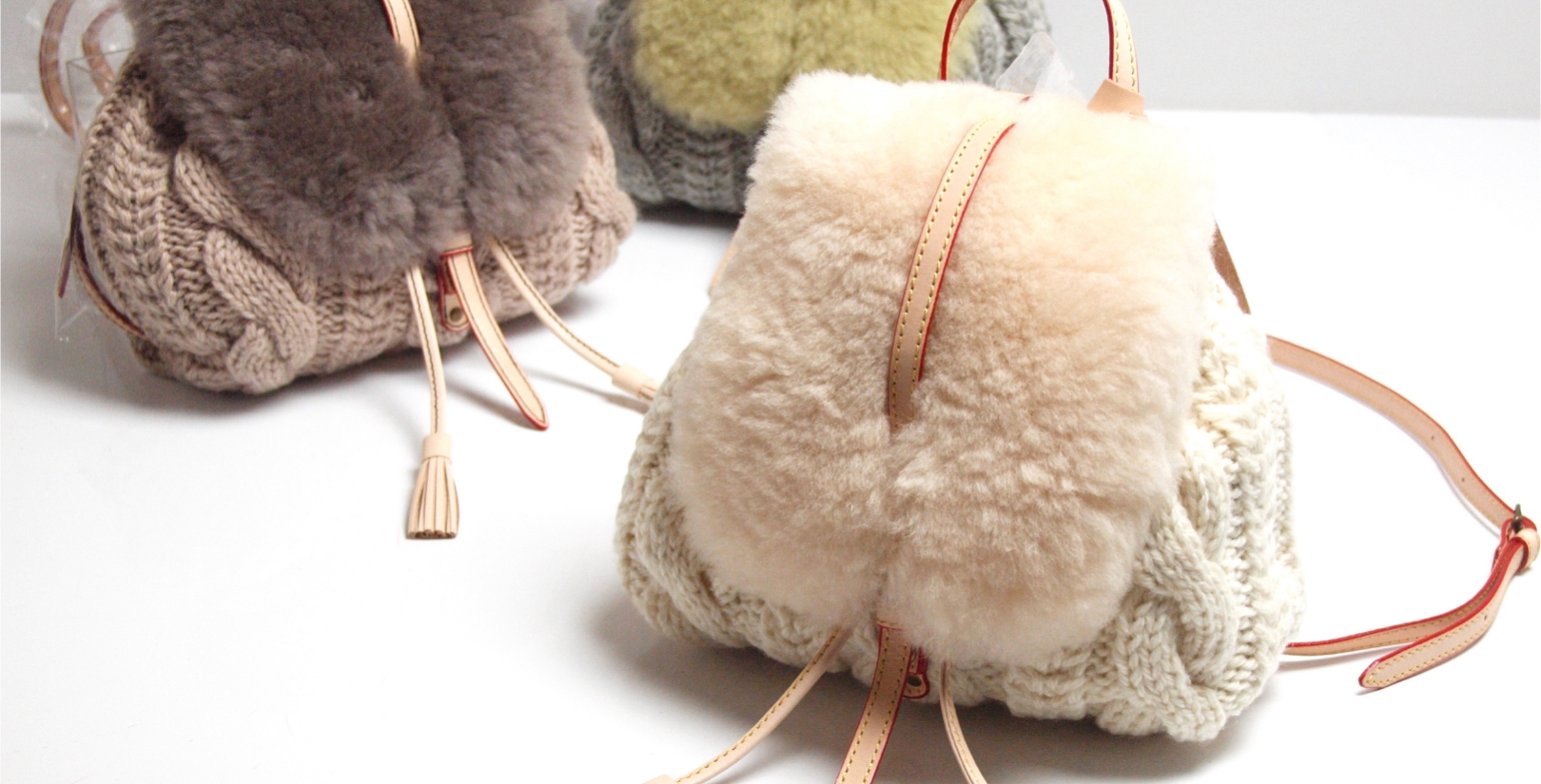 | Model | ムートンカブセに本体手編みニットのリュック小。ムートンポーチ付き。 |